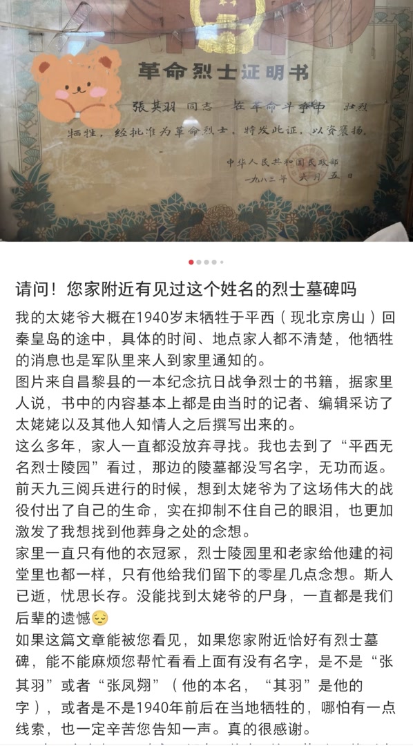 北京日报记者看到求助信息后,立即着手寻找张其羽烈士墓。通过大量查阅县志史料、中华英烈网等信息,记者发现房山区有一位张其羽烈士的信息。通过与房山区退役军人事务局确认,这位张其羽烈士为冀东人,1940年底在房山牺牲,目前安葬在霞云岭乡堂上村。经过进一步核实,长眠于堂上村的张其羽烈士与籍贯为昌黎县的张其羽烈士信息吻合。至此,历时四代人85年的寻找,张其羽烈士墓终于找到了!