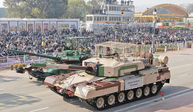 除了LR-AShM导弹之外,印度在“共和国日”阅兵式上还重点展示了其他多种国产装备。印度报业托拉斯26日以《印度在“共和国日”阅兵式上全面展示军事实力》为题报道称,印度在此次阅兵式上展示了导弹、新组建的部队、精锐方队以及各种国产武器系统,反映了印度不断增强的军事能力和国防制造方面的自力更生能力。印度国产“阿琼”MK1主战坦克与俄制T-90主战坦克并肩行驶,它们的炮塔顶部都“与时俱进”地安装了栅栏装甲用于防备无人机袭击。同时公开亮相的还包括国产“北极星”轻型直升机和“鲁德拉”武装直升机,它们具备在高原地带作战的能力,被印军视为空地协同作战的关键装备。