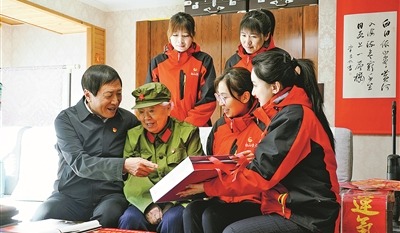 第三站,来到89岁的陶俊元家。在抗美援朝战场上,老人曾服役于志愿军空军雷达部队,是大中型无线电台操作员,在战备执勤中表现出色。得知老人当年的事迹后,宁凤莲从去年八一建军节开始将其列入慰问对象。一进门,志愿者就将大红的“福”字装饰画悬挂在客厅玄关,屋内顿时多了几分节日的喜庆。