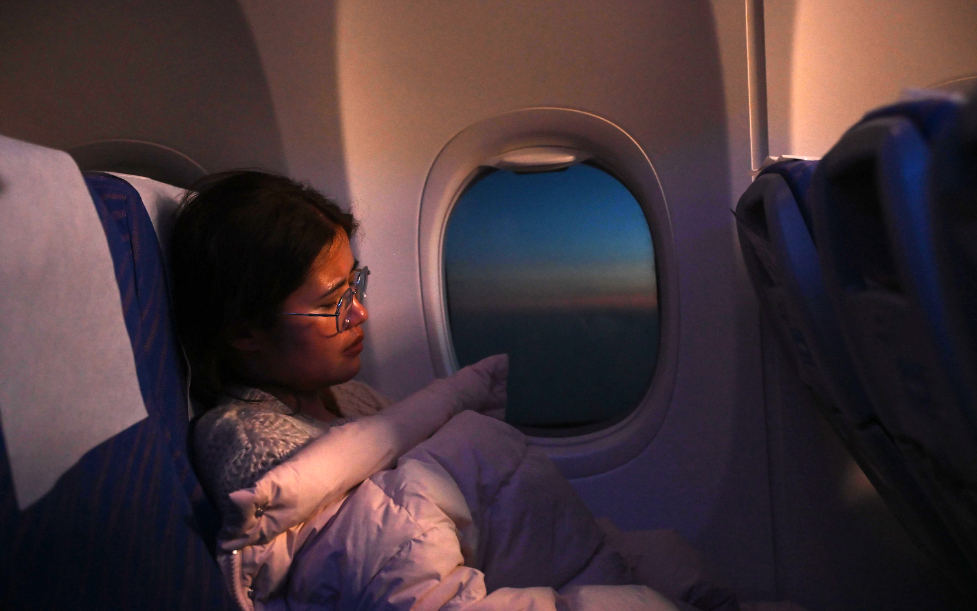 南宁飞成都,成都转机到喀什,一天飞行了近4000公里,疲惫的黄歆在飞机上睡着了。