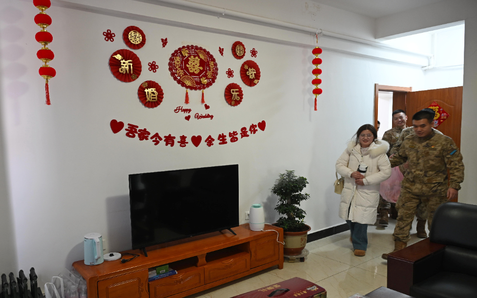 家属临时来队房墙上贴着喜字拉花,床上洒满心形花瓣,雷达站为这对阔别一年的新婚夫妻,精心准备了小惊喜。