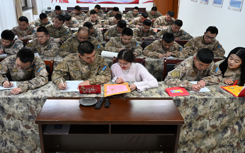在电视房内,蒙明涛和妻子黄歆为内地的学生们回信。每年春节期间,驻守在高原的官兵都能收到来自天南海北的祝福。