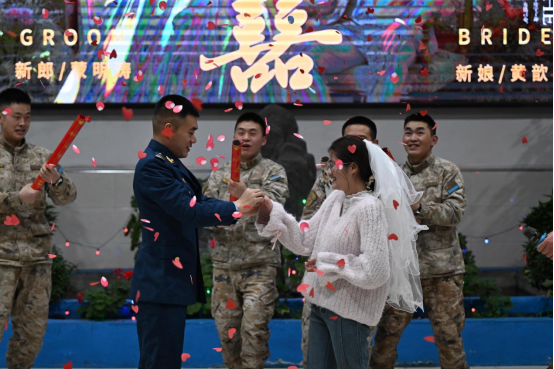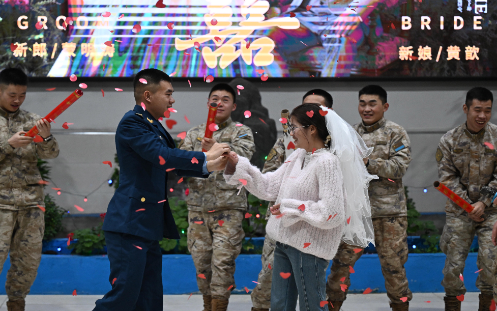 在雷达站组织的新春联欢晚会上,依据家乡习俗,战友们为他们举办了简约又浪漫的军营婚礼。