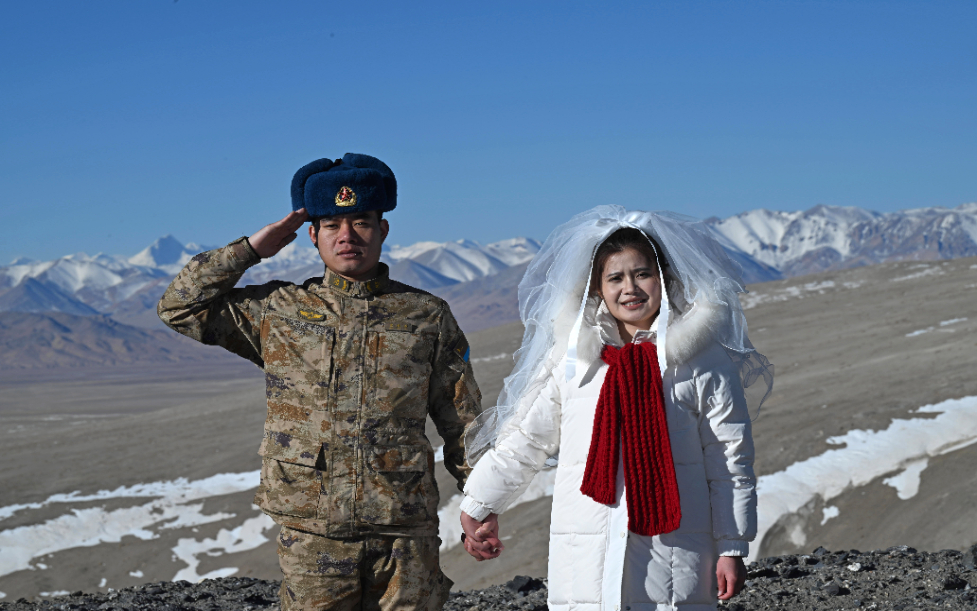 左手牵你,右手敬礼。在喀喇昆仑,蒙明涛对妻子黄歆立下“不负祖国不负卿”的誓言。