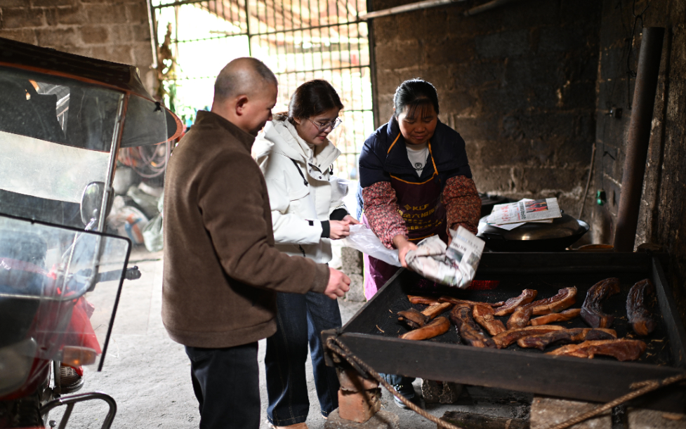 出发前,黄歆开车到大山深处的父母家里给蒙明涛带上家人亲手制作的腊肠、腊肉等食品。