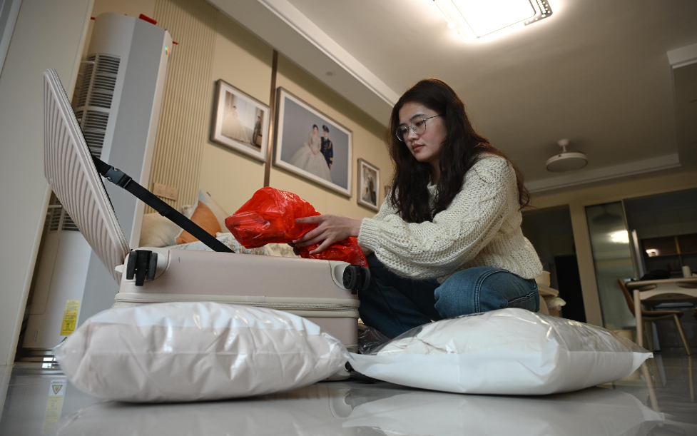 出发前,黄歆在巴马的婚房内将家乡的“味道”尽可能多地塞进齐腰高的行李箱。