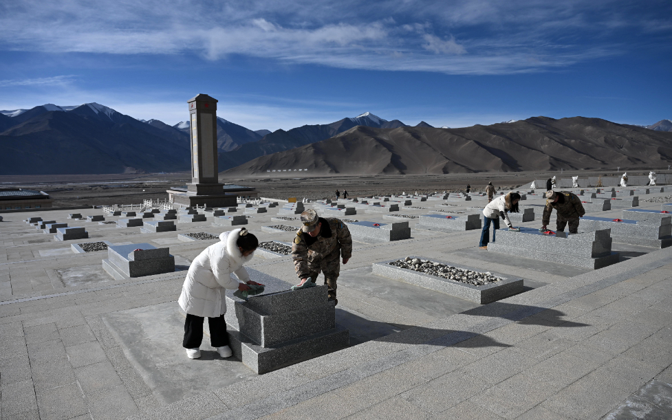 蒙明涛带妻子黄歆到康西瓦烈士陵园祭奠在喀喇昆仑牺牲的边防军人。