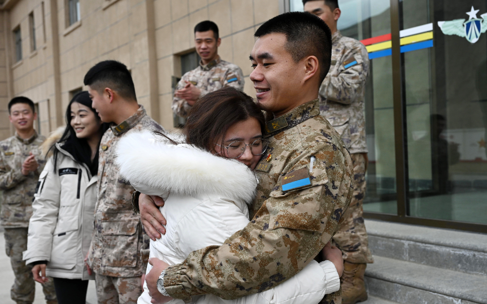 经过60多个小时的奔波,黄歆终于见到了那个熟悉的身影。在官兵的喝彩声中,蒙明涛和妻子紧紧相拥。