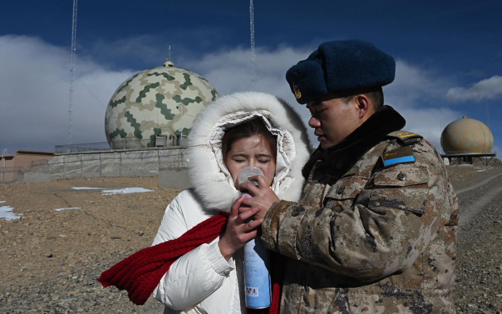 在海拔5000余米的雷达阵地上,蒙明涛给妻子黄歆吸氧,讲述雷达站的故事。