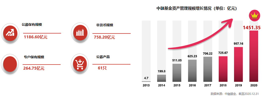 根据中融基金数据统计,自2013年成立以来,中融基金始终保持着高质量的快速成长,截至2020年12月31日,资产管理总规模1451.35亿元。其中公募管理规模1186.60亿元,非货币管理规模758.20亿元。排名稳居行业前30%。