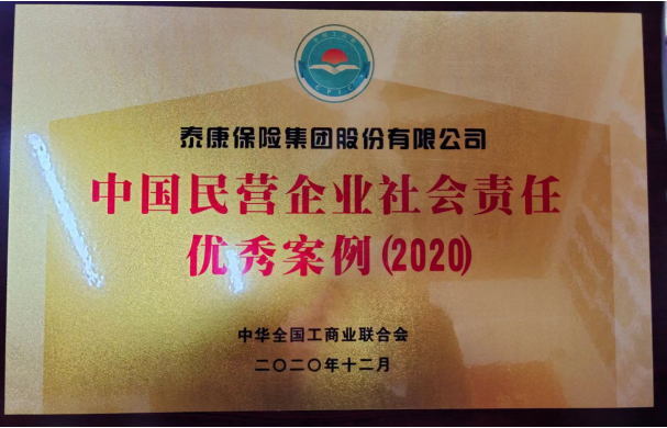 2020年12月30日,为使社会全面了解民营企业履行社会责任的实践成就,树立宣传我国民营企业履行社会责任的形象,由全国工商联主办的“2020中国民营企业社会责任报告发布会”在京举行,会上发布了《中国民营企业社会责任报告(2020)》,泰康保险集团凭借在社会履责领域的亮眼表现,入选“2020年度中国民营企业社会责任优秀案例”。