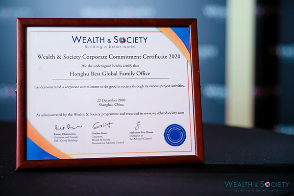 (泓湖百世全球家族办公室获得的亚洲银行家“2020财富与社会企业承诺认证”奖)