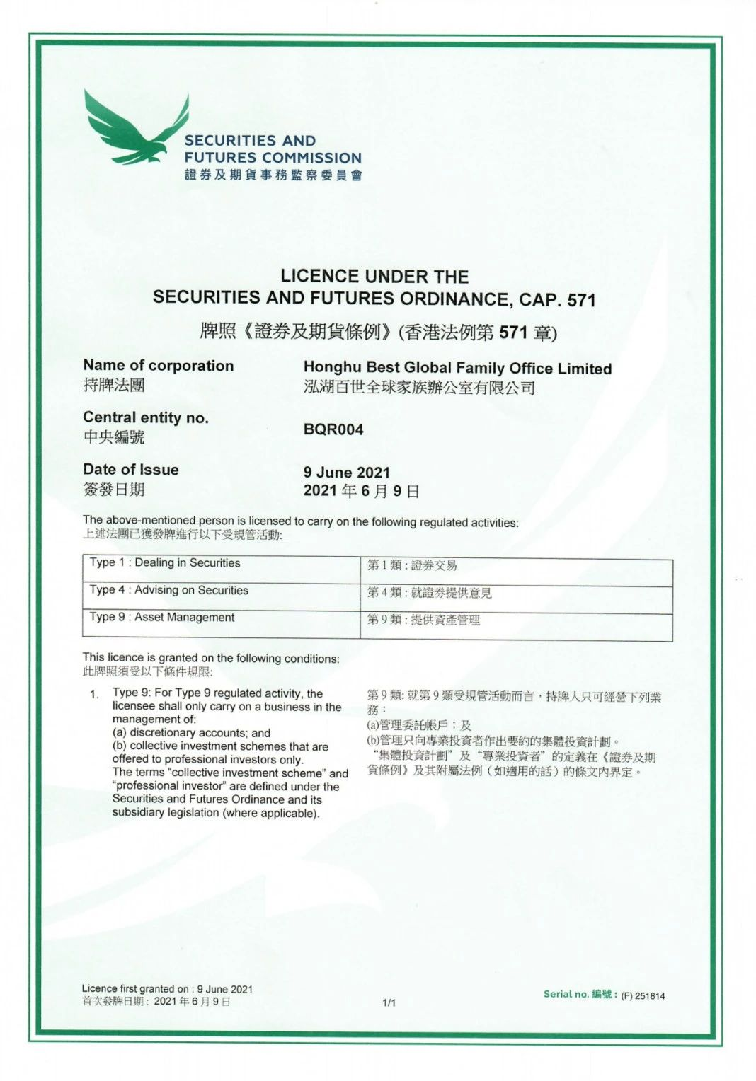 6月9日香港证监会正式批准了泓湖百世全球家族办公室申请的1类“证券交易牌照”、4类“证券提供意见牌照”以及9类“提供资产管理牌照”。