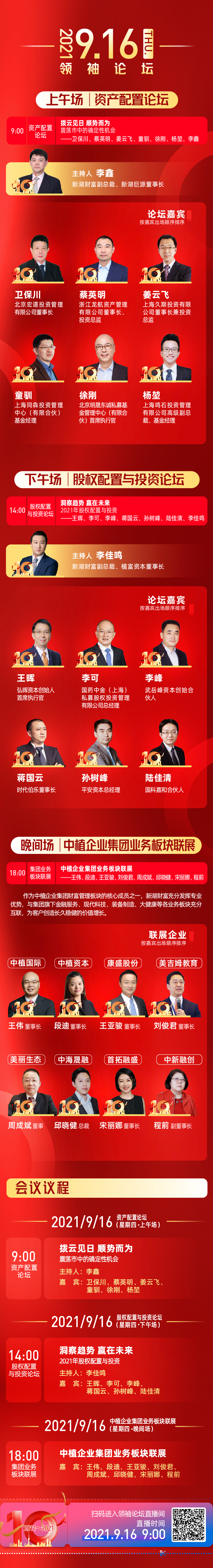 通过大咖们的精彩分享,很多朋友对宏观经济趋势、资产配置策略、财富管理之道都有了更加深入的了解。在9月16日09:00,多位商企领袖和资产配置领域的实践者,将为大家带来更多细分领域、更具实战价值的投资分享。可扫描下图二维码锁定直播间。