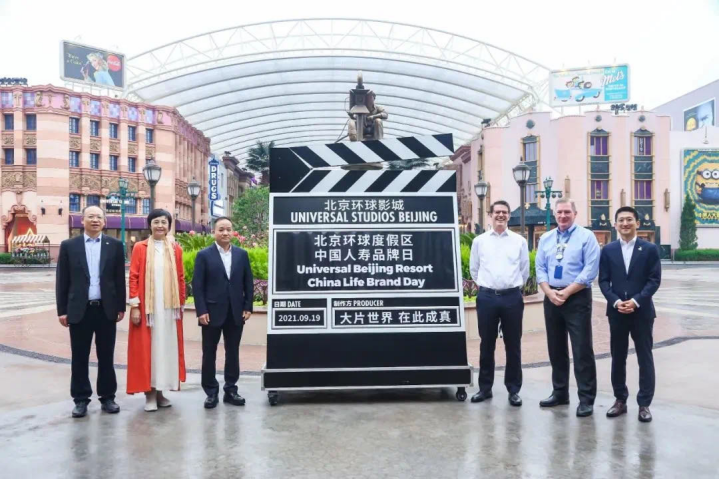 中国人寿集团副总裁盛和泰、寿险公司副总裁杨红、财险公司副总裁傅天明,与环球主题公园及度假区国际业务总裁及首席运营官裴知(Page Thompson)、北京环球度假区总裁兼总经理苗乐文(Tom Mehrmann)、北京国际度假区有限公司副总经理褚博瑶在象征片场的大型电影开机板旁合影,拉开“中国人寿品牌日”序幕。
