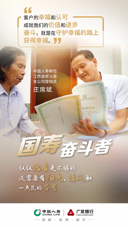 事实上,庄席斌只是无数“奋斗国寿人”的一个代表和缩影。点滴汇聚,以成江河;梧桐并闾,极望成林。在中国人寿“成己为人 成人达己”企业文化核心理念引导下,还有很多国寿人们在各自的工作岗位上不断超越自我,诚实守信、专业高效,在为客户带来周到暖心体验的同时,也在客户的认可和满意当中,成就了自身更高价值,收获了自身更大幸福。正是他们的坚持不懈和持续奋斗,让中国人寿交出了一份份客户满意、市场瞩目、投资者认可的优秀答卷。