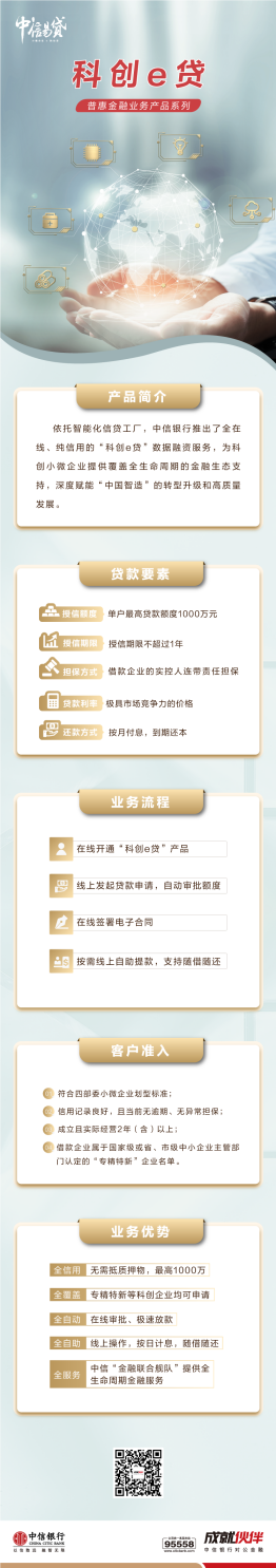 近期,中信银行推出全线上、纯信用的“科创e贷”产品,这是中信银行积极响应国家创新发展,依托智能化信贷工厂,构建科创智能风控体系,为“专精特新”等科技创新型企业提供的全线上、纯信用、随借随还专属金融服务,致力于解决科创融资供给的“不平衡、不充分”问题,实现了对优质科创小微企业的高效支持和有效覆盖。
