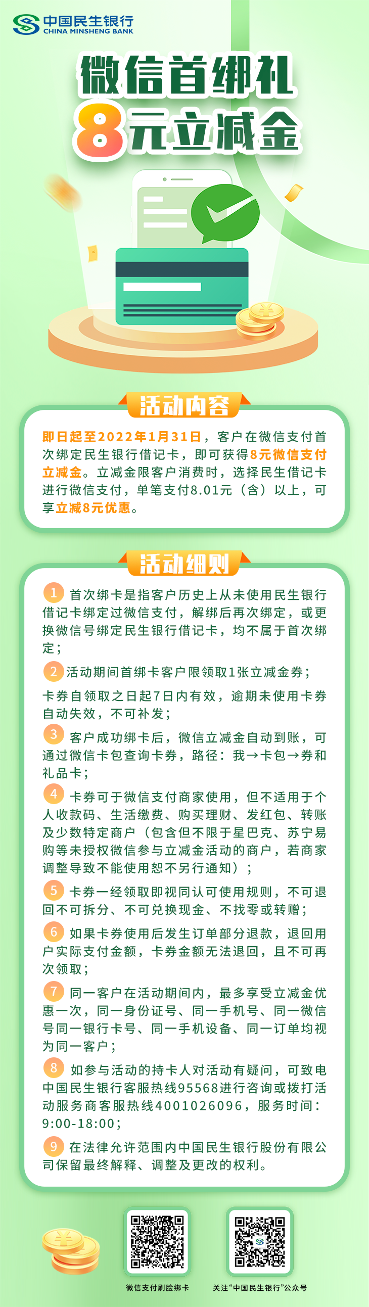 微信首绑民生借记卡立领8元微信立减金-新华网
