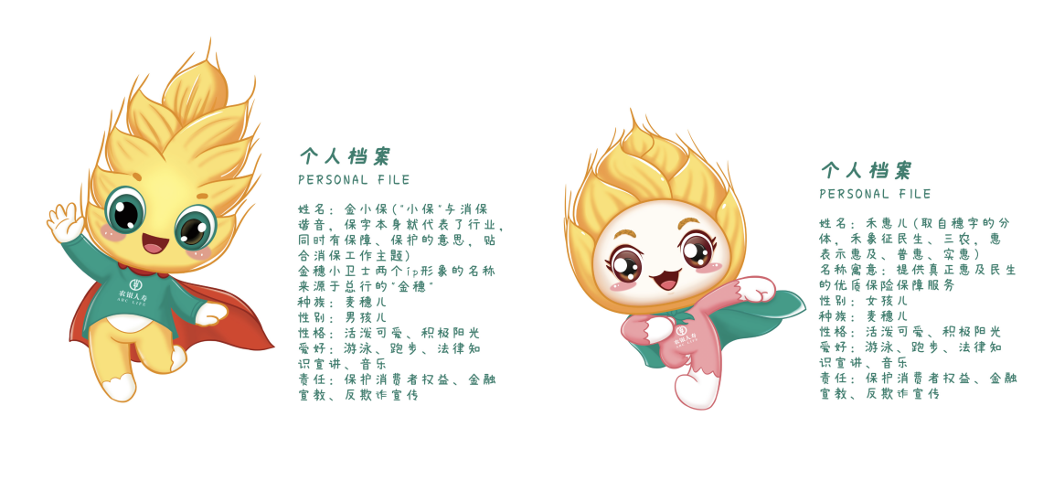 值得一提的是,为创新开展“3·15”宣传活动,农银人寿特别推出农银消保IP形象“金穗小卫士”——“金小保”、“禾惠儿”。作为公司消保宣传主形象,“金穗小卫士”将连同公司同步推出的消保系列表情包,通过可视化、标识化传播载体,以轻松活泼的方式向广大公众宣传消保理念,进一步增强消保宣传效果。