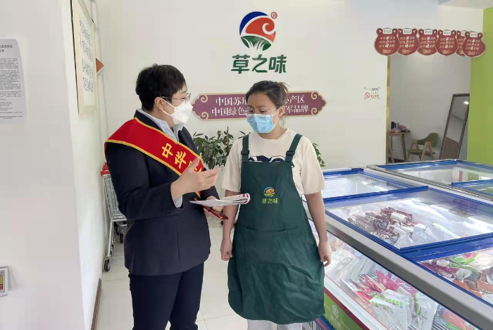 图片3:保险公司人员向“草之味”苏尼特羊肉旗舰店店员介绍食责险 肖海毅摄