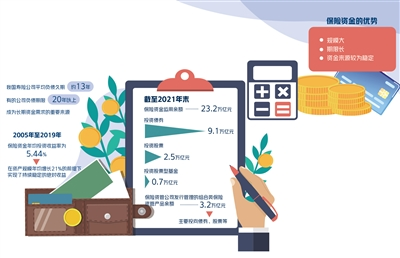 中国银保监会的最新数据显示,截至2021年末,保险资金运用余额23.2万亿元,其中投资债券9.1万亿元,投资股票2.5万亿元,投资股票型基金0.7万亿元。此外,保险资管公司发行管理的组合类保险资管产品余额3.2万亿元,主要投向债券、股票等。保险资金作为资本市场最大的机构投资者之一,在支持资本市场稳健运行、优化投资者结构方面发挥了重要作用。