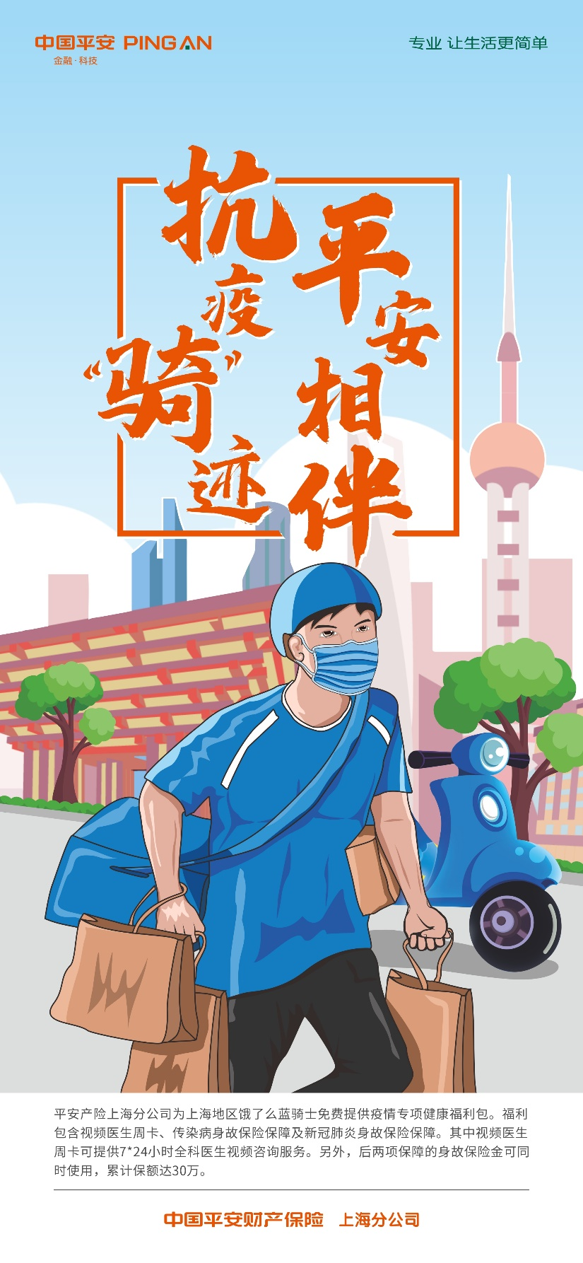 自疫情防控全面进入应急状态以来,物流成为疫情防控阻击战的“生命线”,平安产险上海分公司近日已为上海地区的饿了么平台“蓝骑士”免费提供疫情专项健康福利包。福利包含视频医生周卡、传染病身故保险保障及新冠肺炎身故保险保障。其中,视频医生周卡可提供7*24小时全科医生视频咨询服务。另外,后两项保险保障的身故保险金可同时使用,两者累计保额高达30万元。通过给快递工作人员提供保险保障,平安产险上海分公司为他们的平安出行保驾护航,进而助力城市居民生活物资“运得畅、供得上、送得到”。