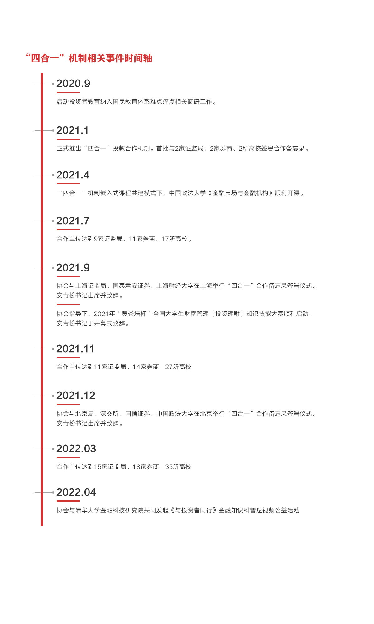 为进一步贯彻落实《国务院办公厅关于进一步加强资本市场中小投资者合法权益保护工作的意见》(国办发〔2013〕110号)《证监会 教育部关于加强证券期货知识普及教育的合作备忘录》(证监发〔2019〕29号)等文件要求,2021年初,协会联合证监局推出“一会、一局、一司、一校”投教合作机制(以下简称“四合一”机制),引导行业深入高校推动投资者教育纳入国民教育体系, 取得了多方面的社会效益。