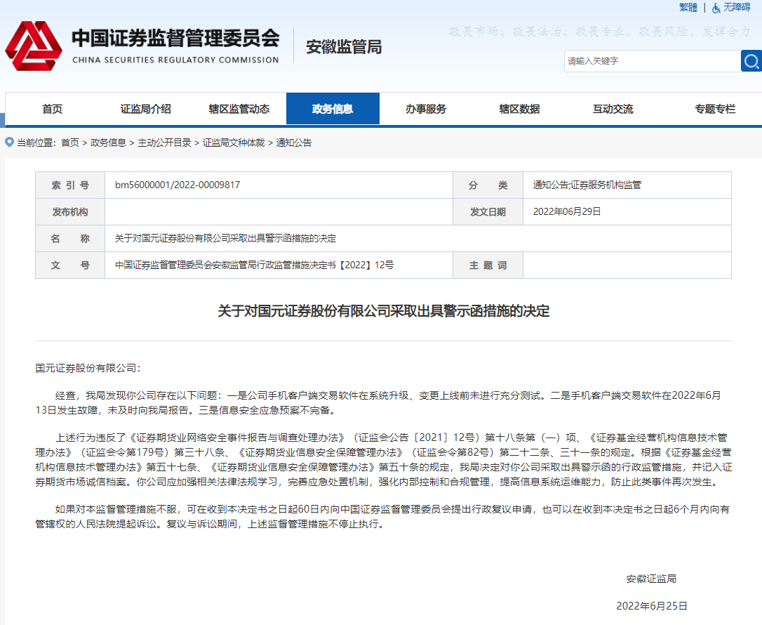 决定书显示,安徽证监局发现国元证券存在以下问题:一是公司手机客户端交易软件在系统升级、变更上线前未进行充分测试。二是手机客户端交易软件在2022年6月13日发生故障,未及时向安徽证监局报告。三是信息安全应急预案不完备。