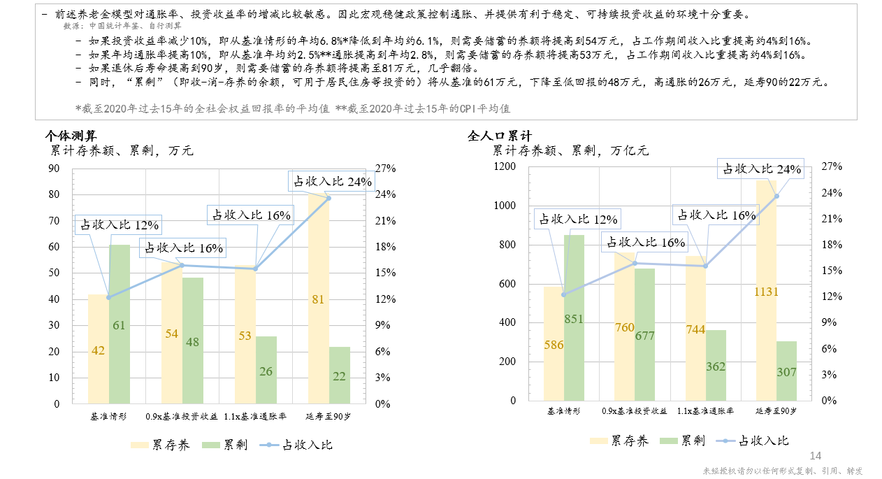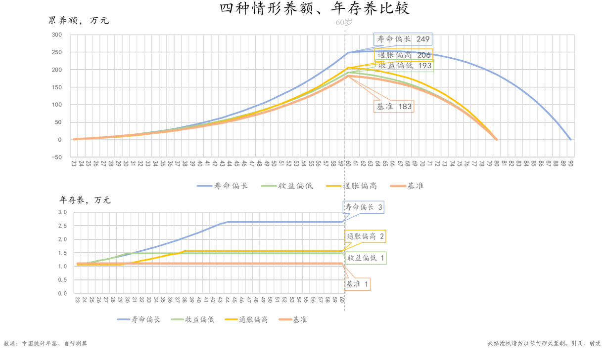 以上是基础模型,如果改变模型的一些基本假设,就能对模型进行敏感性测试。比如可以假设通胀偏高10%,或回报偏低10%,抑或是预期寿命变为90岁,模型的其他条件保持不变,仍然是60岁之前积累养老基金,生命截止时恰好消耗完,在此基础上对模型进行重新计算。结果显示,如果投资收益率减少10%,则需要在工作期间储蓄的养老储备额将提高到54万元,占工作期间收入比重提高约4%到16%。如果年均通胀率提高10%,则需要储蓄的养老储备额将提高到53万元,占工作期间收入比重也将提高到16%。如果退休后寿命提高到90岁,则需要储蓄的存养额将提高至81万元,几乎翻倍。同时,“累剩”(即收-消-存养的余额,可用于居民住房等其他投资的)将从基准的61万元,下降至低回报的48万元,高通胀的26万元,延寿到90岁的22万元。