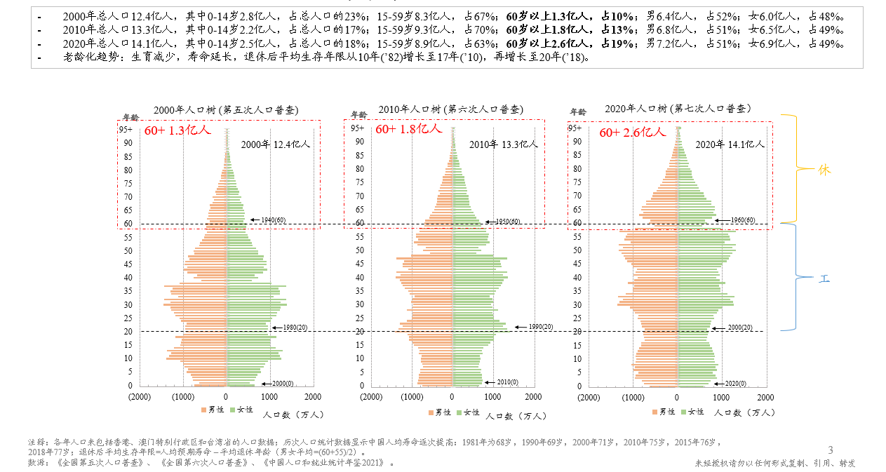 从2000年、2010年和2020年这三次人口普查数据生成的年龄结构图来看,20岁以下部分在逐步收窄,60岁以上部分则在逐步变大,反映了人均寿命的延长。