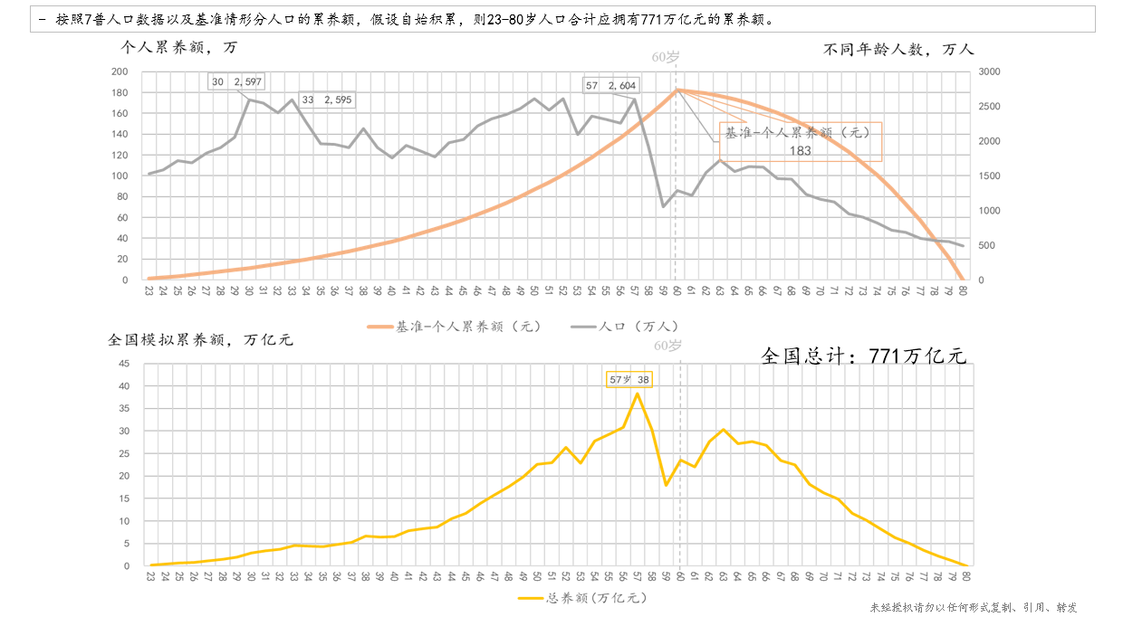 前文讨论了个人养老金的模型模拟,如果将个人养老金累计余额曲线与人口结构曲线相结合,那么便能够得到我国整体个人养老金累计余额的“应然”情形。