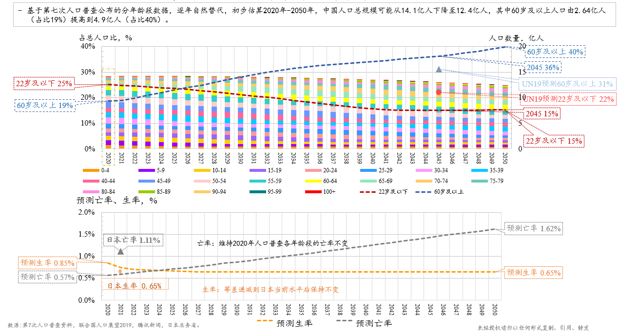 图4 中国人口数量与年龄结构推算(2020-2050)