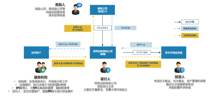 一般而言,巨灾债券的运行机制和运作参与者主要涉及以下几方:债券发起人(一般也是巨灾风险的分出人)、发行人(特殊目的保险公司,简称SPI)、投资人、第三方服务机构。其中,发起人(分出人)是巨灾债券事项的发起主体、巨灾债券成本的承担者和巨灾债券风险标的的提供者。发行人是单独设立的特殊实体,是巨灾债券的实际发行主体和巨灾债券风险标的的接受者。投资人是购买巨灾债券的主体,一般为专门的巨灾基金、机构投资者(如银行、养老基金等)等。第三方服务机构包括承销商、法律顾问、SPI保险管理人、信托机构等,主要负责债券的发行与销售、法律文书的起草和审阅、SPI的日常管理、托管账户的操作等工作。下图描述了典型的巨灾债券运行机制: