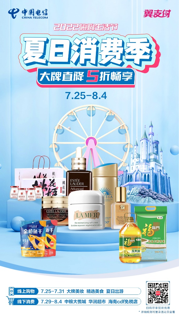2022年暑期,中国电信联合中粮集团、华润集团、中国旅游集团、中国农发集团多家央企举办“2022嗨购生活节”活动,以高品质产品、新用户体验、新消费模式满足消费者多元服务需求,推动消费潜力释放,开启翼支付新平台合作新篇章。