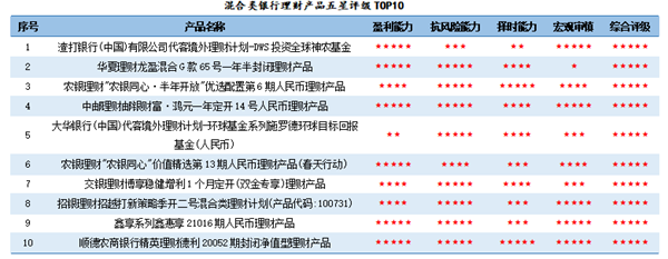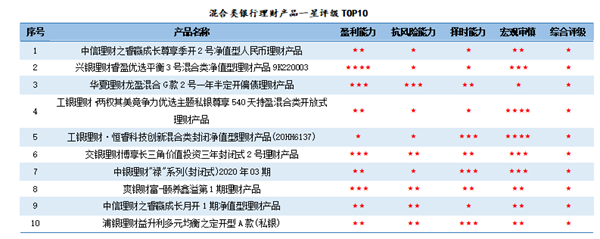 混合类银行理财产品五星评级前10名榜单中,农银理财旗下2只产品上榜,交银理财、招银理财各有1只产品上榜;工银理财和中信理财旗下各2只产品上榜一星评级TOP10。