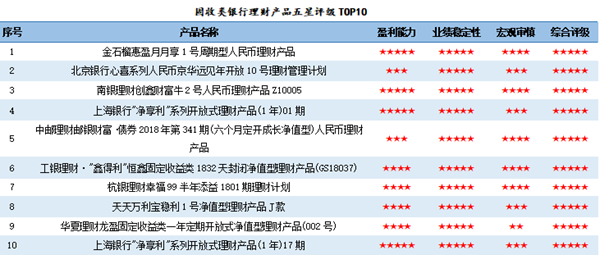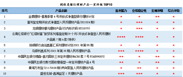 此次《报告》对银行理财固定收益类产品的定义是投资于权益类资产的比例不低于80%,评级维度由盈利能力、业绩稳定、宏观审慎三部分组成。在固收类银行理财产品五星级评级TOP10榜单中,上海银行旗下2只产品、工银理财旗下1只产品上榜。