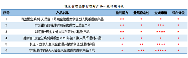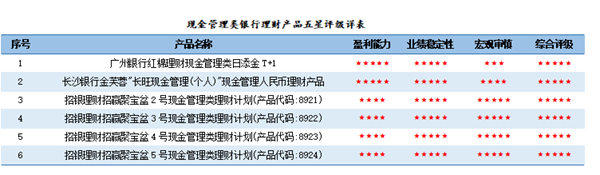 根据现金管理类银行理财产品评级表单显示,共有6只产品获得五星综合评级,其中招银理财占4只,广州银行和长沙银行各有1只;6只产品获得一星综合评价。