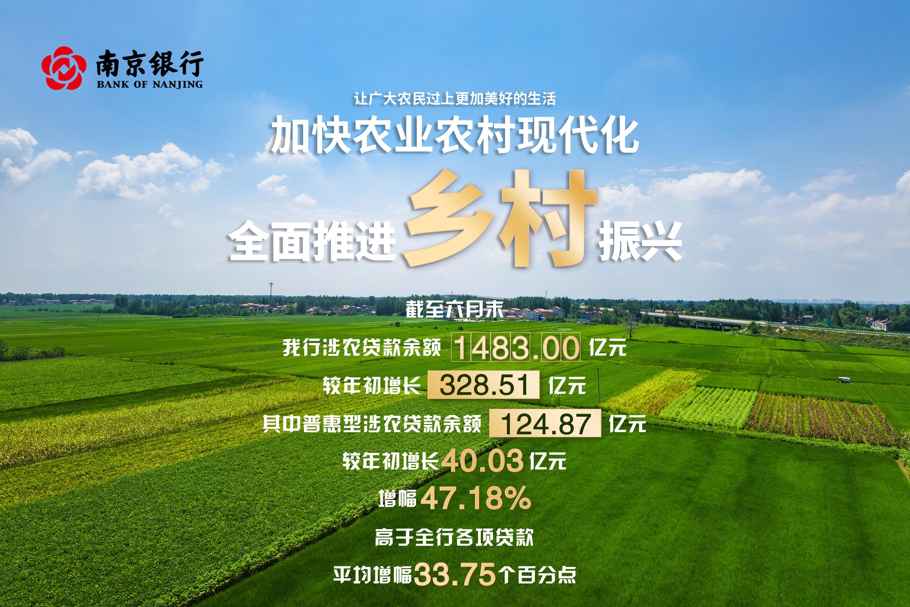 推进乡村振兴、促进民生改善需要驰而不息、久久为功。今年以来,南京银行充分履行城商行责任担当,积极服务全面推进乡村振兴,截至2022年6月末,南京银行涉农贷款余额1483.00亿元,较年初增长328.51亿元。下一步,南京银行将进一步推动巩固脱贫攻坚成果与推进乡村振兴相衔接,以金融之笔书写新时代山乡巨变,助力乡村振兴同脱贫攻坚两大历史任务顺利交棒,用时代作为和亮丽成绩,迎接党的二十大胜利召开。
