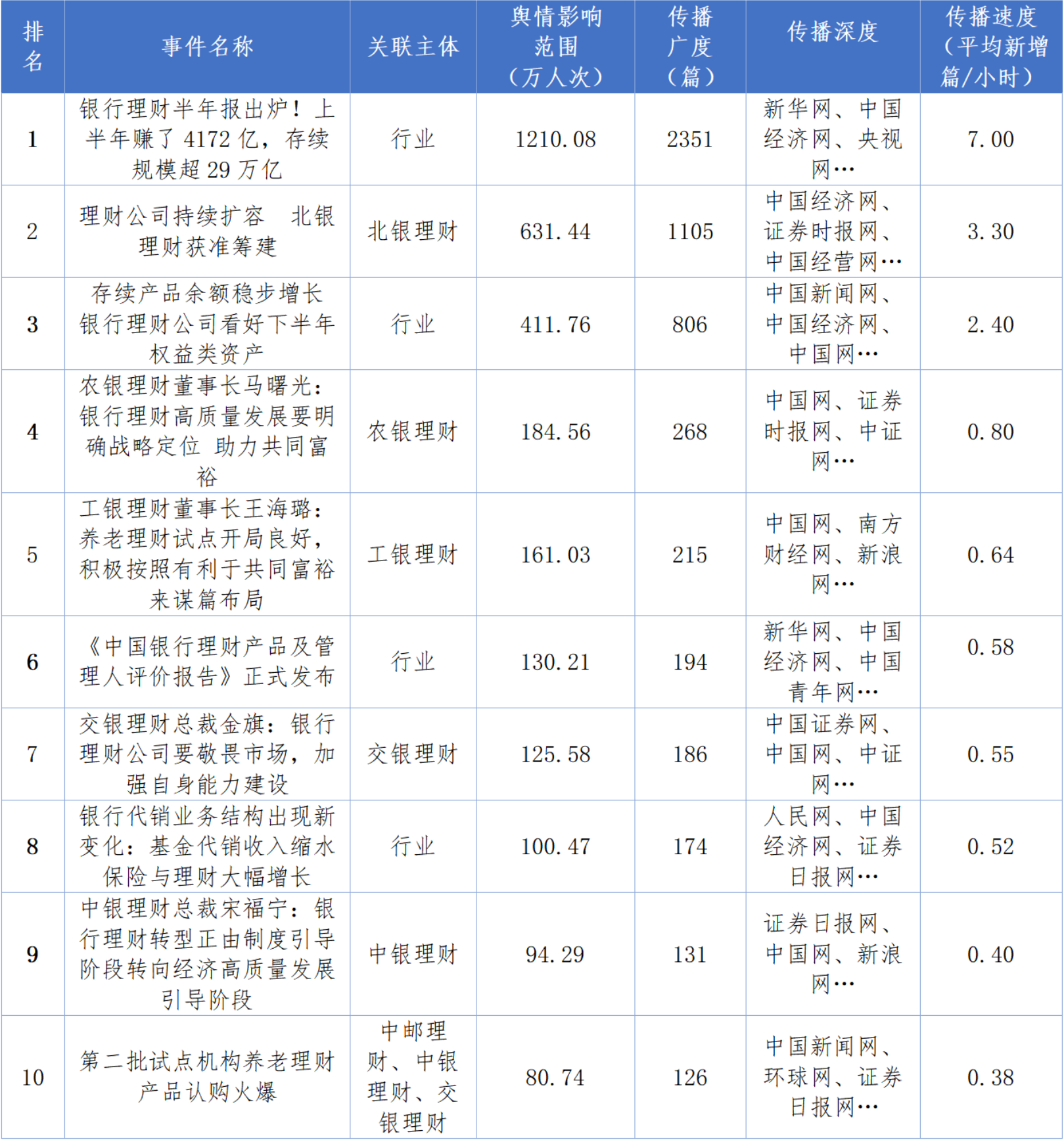 正面舆情主要集中在《银行理财半年报出炉!上半年赚了4172亿,存续规模超29万亿》《存续产品余额稳步增长 银行理财公司看好下半年权益类资产》《理财公司持续扩容 北银理财获准筹建》等方面;敏感舆情焦点主要是《1万元银行理财15个月仅赚9元,业绩比较基准为何“不准”》(人民网)等。