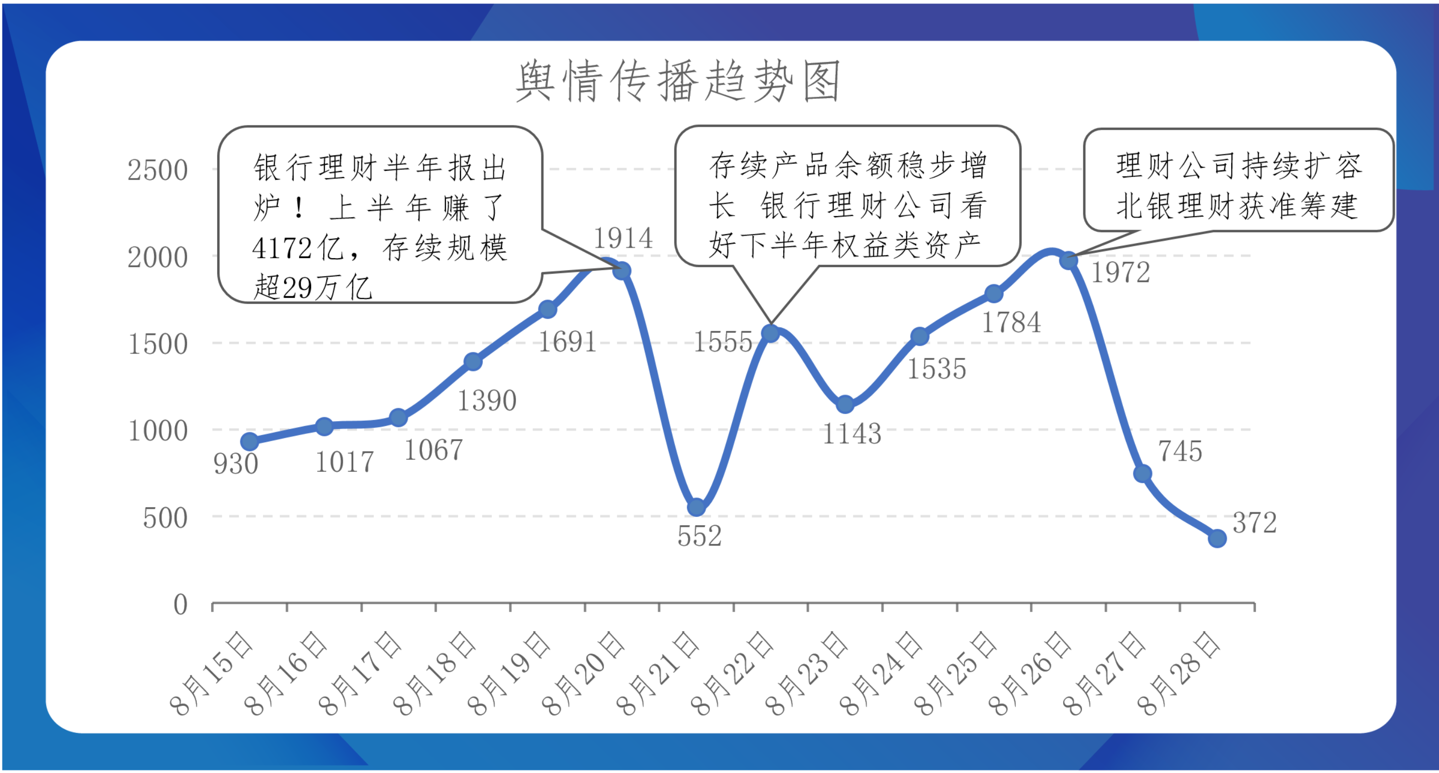 本时段内,行业舆情传播趋势起伏变化较大,最高峰值出现在8月26日,核心传播事件为“理财公司持续扩容 北银理财获准筹建”。