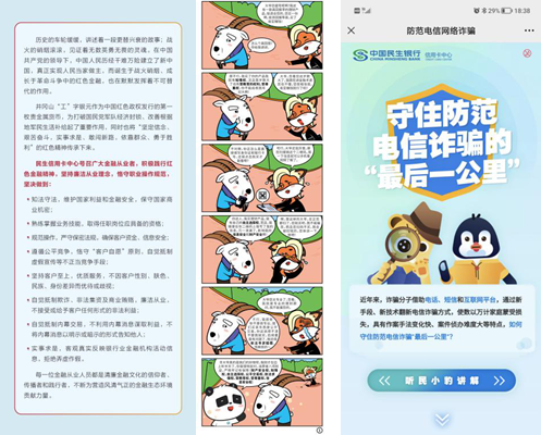 另一方面,为进一步提升活动影响力,中国民生银行信用卡中心自主设计制作了系列主题单页、漫画、视频、H5等宣教材料,并通过线上宣传渠道进一步扩大宣教覆盖范围,不断增强金融消费者的风险防范意识,营造积极的网络舆论氛围。