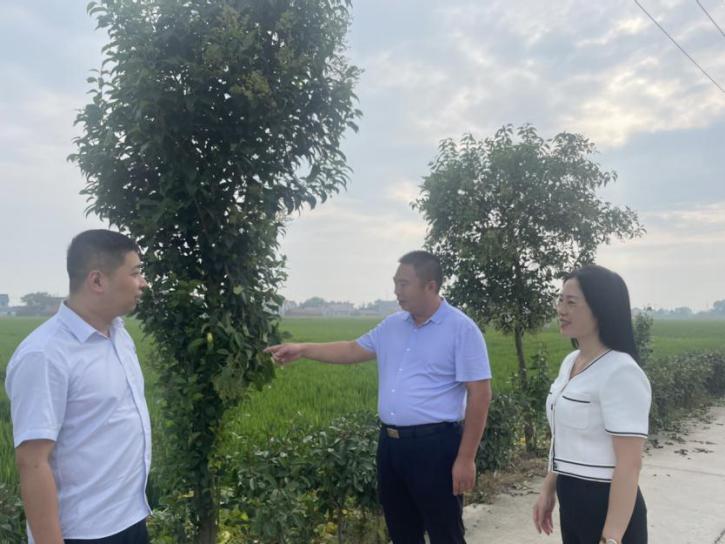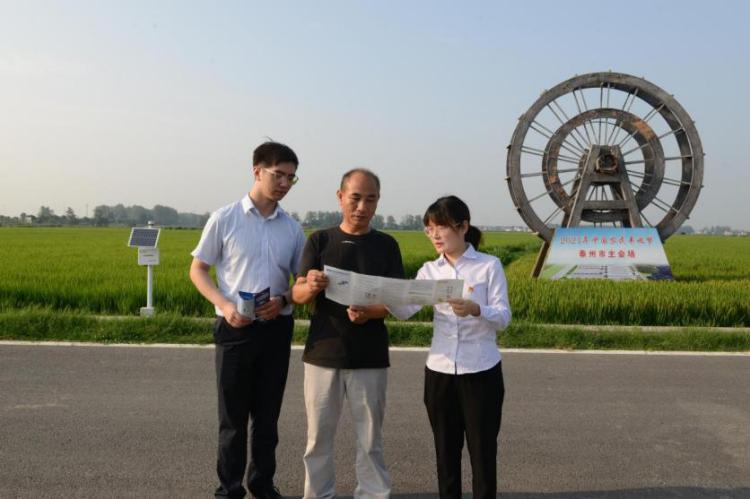 江苏银行工作人员与赵旭东夫妇共同在田间察看农作物生长情况