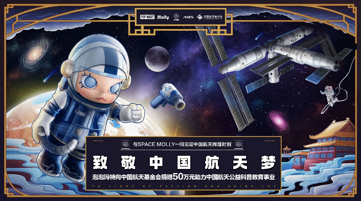 10月31日,中国空间站梦天实验舱发射任务取得圆满成功之际,泡泡玛特携手中国航天上海埃依斯航天科技有限公司(简称 “ASES”)联合推出MEGA SPACE MOLLY 1000% 天阙(简称“SPACE MOLLY天阙”),并宣布向中国航天基金会捐赠50万元,用于青少年航天科普项目。