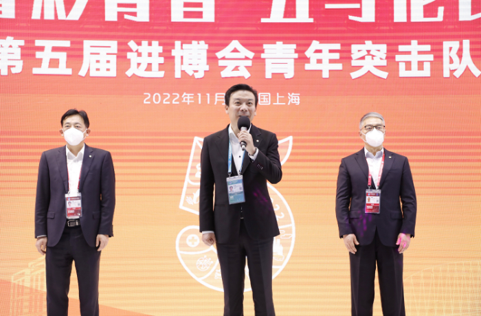 11月2日,在第五届中国国际进口博览会开幕倒计时3天之际,中国太保服务第五届进博会青年突击队誓师出征大会暨“菁彩青春 五与伦比”青春立功行动发布仪式在国家会展中心举行。