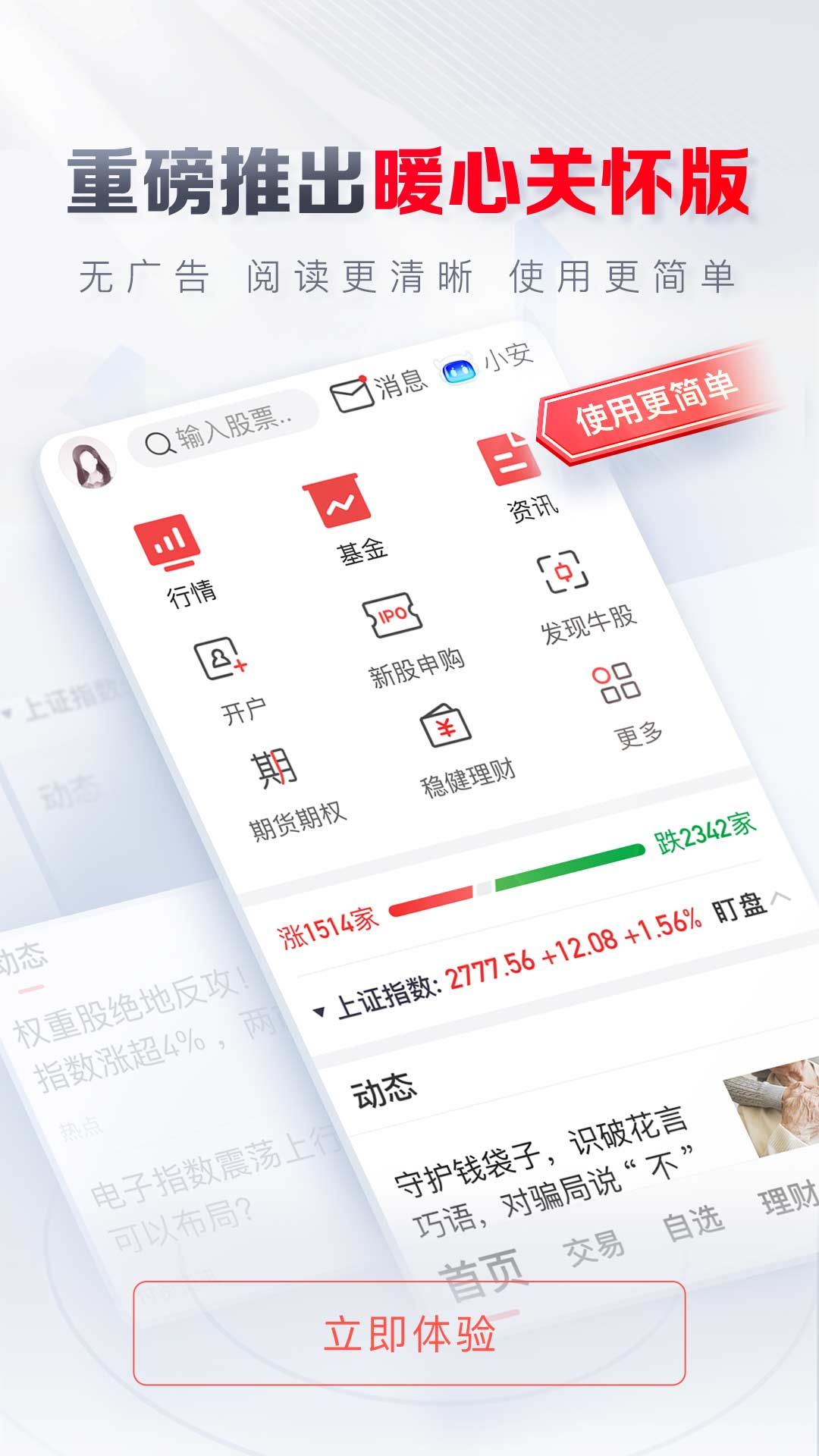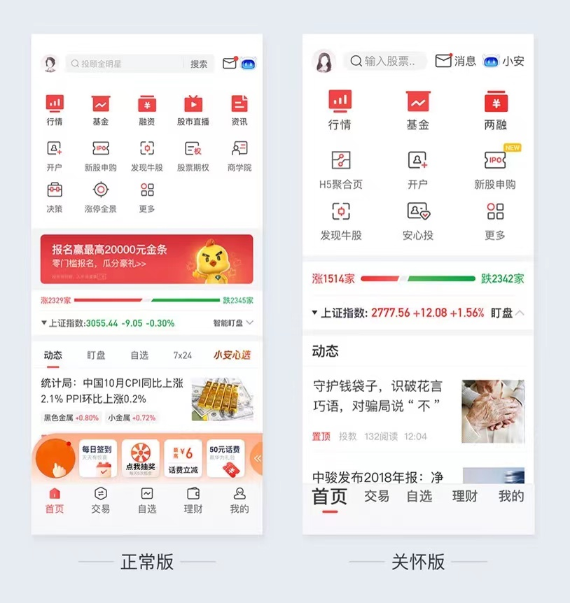 其中,针对老年群体视力衰退后,阅读界面容易感到视觉疲劳的问题,关怀版对字体大小、间距、对比度等进行调整,同时减少广告和各类提示,方便老年人浏览信息,并对老年用户聚焦的核心功能区进行优化,让他们的视觉体验与核心功能操作更为流畅。此外,考虑到老年群体金融意识较为薄弱的情况,关怀版在首页信息流中提供证券等金融相关的防骗知识,提高老年用户的警惕性,避免上当受骗。