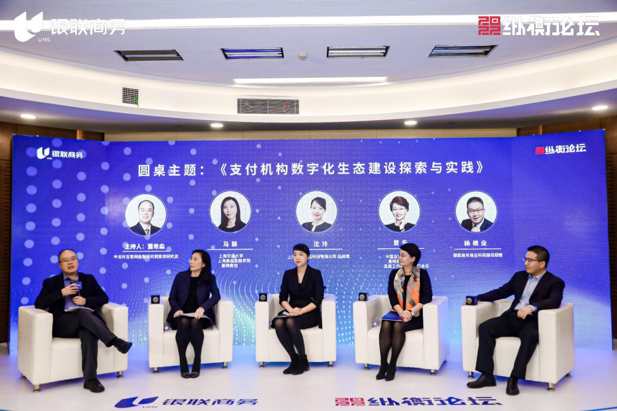 在圆桌论坛环节,中关村互联网金融研究院首席研究员董希淼作为主持人,组织上海交通大学上海高级金融学院教授马颖、奥莱产业发展工作委员会执行会长曾先,张江智荟科技总经理沈玲,以及银联商务商业科技部总经理杨继业围绕“支付机构在数字化生态建设中的探索与实践”进行了深度研讨和交流,分享了支付机构通过综合支付和增值产品在助力企业数字化转型中发挥的积极推动作用和代表案例,畅谈支付机构在数字化生态建设的发展方向和趋势。