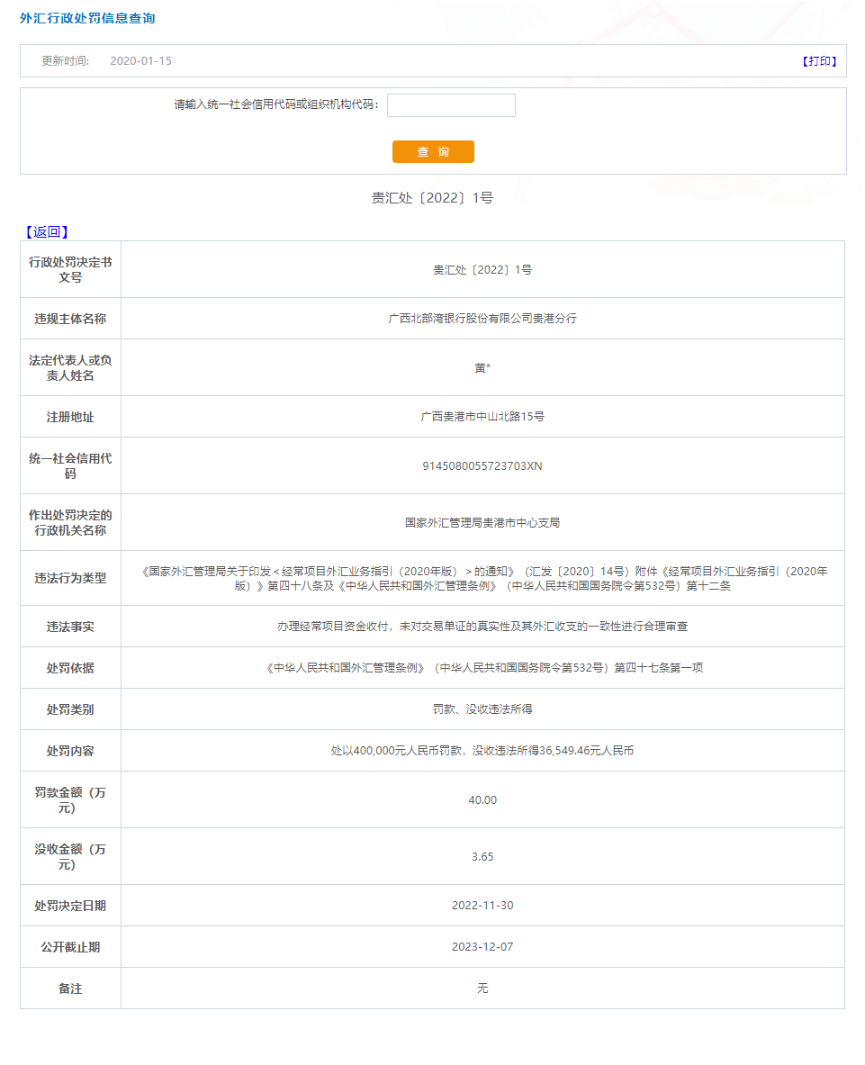 其中,贵汇处〔2022〕1号显示,广西北部湾银行股份有限公司贵港分行办理经常项目资金收付,未对交易单证的真实性及其外汇收支的一致性进行合理审查。依据《中华人民共和国外汇管理条例》(中华人民共和国国务院令第532号)第四十七条第一项,国家外汇管理局贵港市中心支局对其处以40万元人民币罚款,没收违法所得36549.46元人民币。