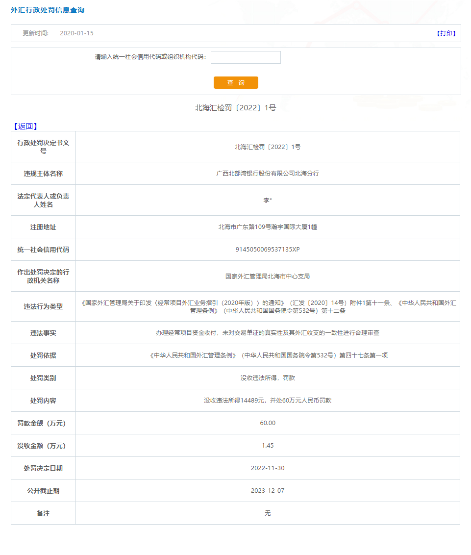 北海汇检罚〔2022〕1号显示,广西北部湾银行股份有限公司北海分行办理经常项目资金收付,未对交易单证的真实性及其外汇收支的一致性进行合理审查。依据《中华人民共和国外汇管理条例》(中华人民共和国国务院令第532号)第四十七条第一项,国家外汇管理局北海市中心支局对其没收违法所得14489元,并处60万元人民币罚款。