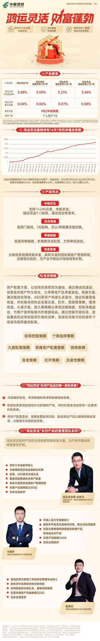 今年以来,面对市场的持续波动,风险较低,流动性较高的的短期理财产品成为了大家应对市场的优选,而鸿运灵活系列产品正满足了大家这样的需求。(推广)