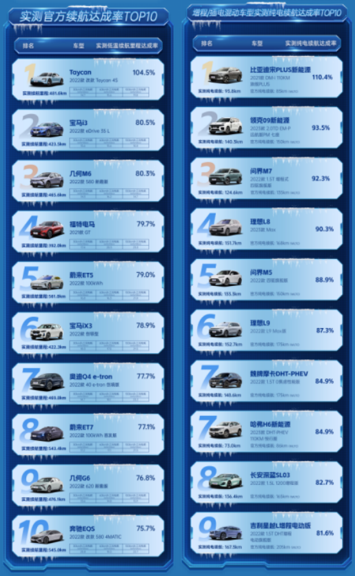 在低温测试中,纯电动车型合资品牌的上榜率高于国产品牌,而增程/插电组上榜车型均为国产品牌;在内蒙古极寒测试完整榜单中,纯电动车组共40辆测试车型,其中25辆为中国品牌车型,15辆为合资、海外品牌车型,中国品牌和合资、海外品牌车型实测的官方续航达成率均值均为45.2%。在内蒙极寒续航达成率榜单前10名中,中国品牌车型占据6台,在前20名中,更是占据了14个席位。此外,本次参与的14款增程/插电混动车型,均为中国品牌,凸显了目前在该技术领域中国品牌车型的绝对市场规模优势以及产品布局的领先。